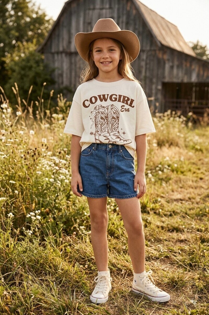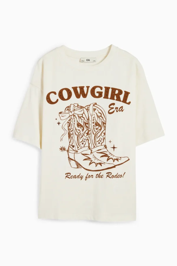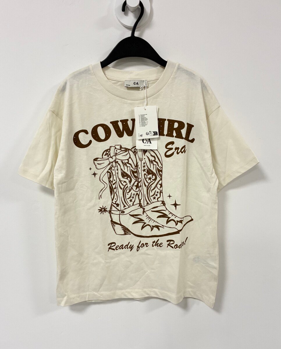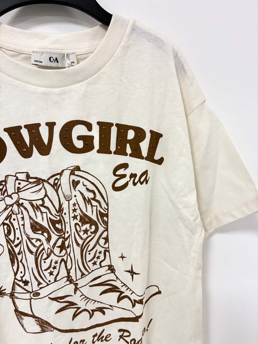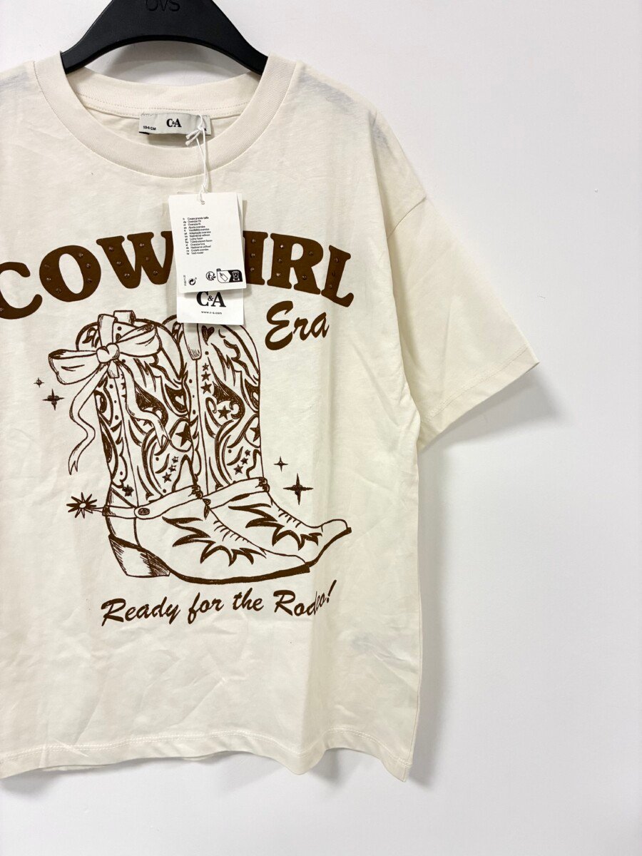 C&A oversize majica za devojcice sa kaubojskim motivima. Vel 9 god (134), ali je siri model, pa moze i za 10, mozda i za 11 godina. Sastav 100% pamuk. Novo sa etiketom.