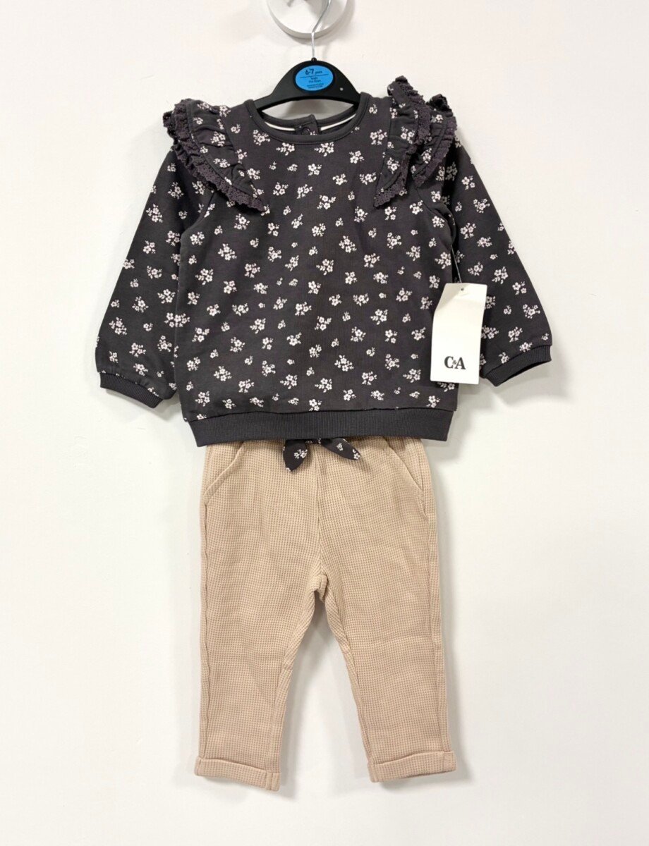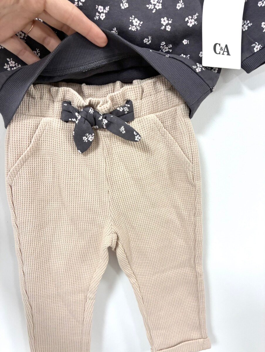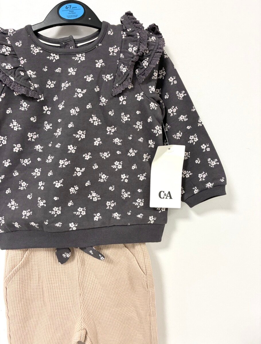 C&A kompletic za bebe devojcice, sivi cvetni duks sa karnerima i donji deo/pantalonice vafl tkanja u bez boji sa masnom u istom dezenu kao duks. Vel 9-12 mes (80). Sastav 100% pamuk. Novo sa etiketom.
