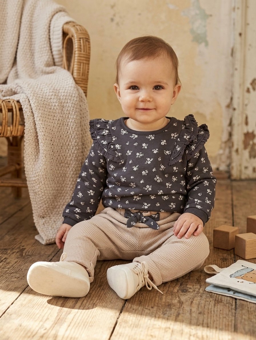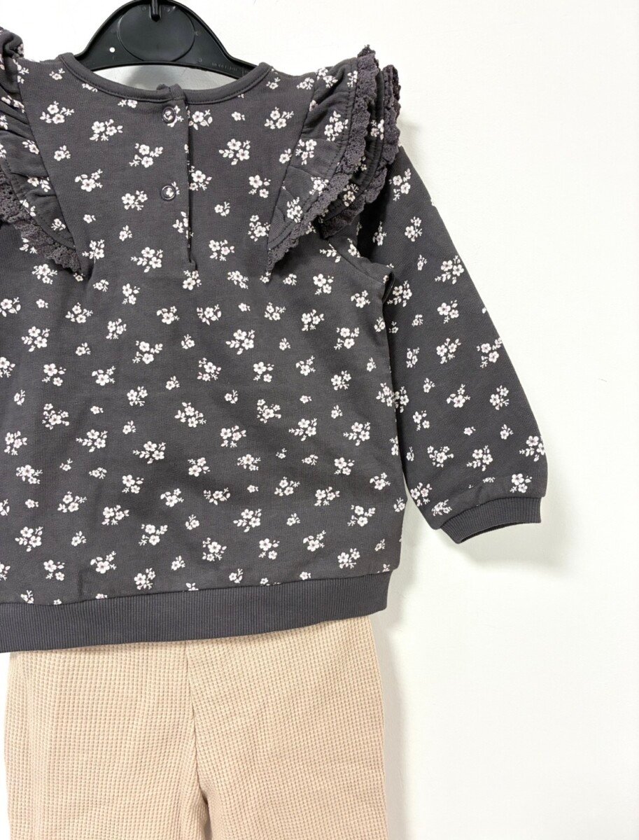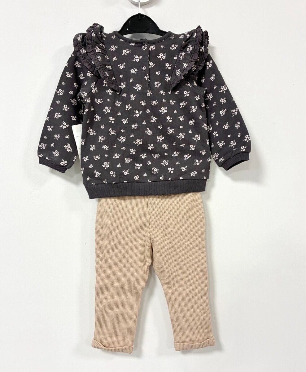 C&A kompletic za bebe devojcice, sivi cvetni duks sa karnerima i donji deo/pantalonice vafl tkanja u bez boji sa masnom u istom dezenu kao duks. Vel 9-12 mes (80). Sastav 100% pamuk. Novo sa etiketom.